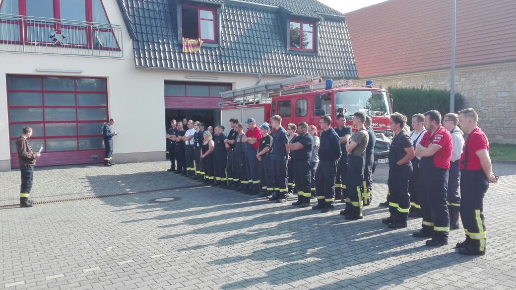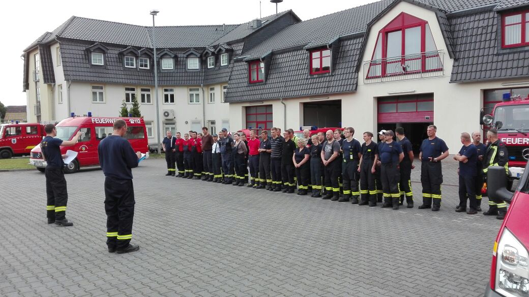 Die rund 40 Einsatzkräfte wurden durch den Gemeindewehrleiter Alexander Laßbeck, Ortswehrführer Mario Reyer sowie dem Organisator des Wochenendes, Kamerad Michael Jentsch, begrüßt und in den Ablauf eingewiesen. Auch die Aufteilungen wer welches Fahrzeug besetzt bzw. in welcher Funktion er an diesem Abend tätig ist wurde festgelegt.