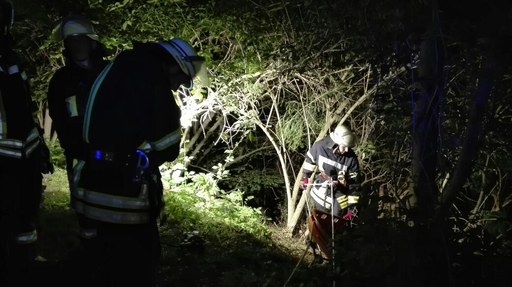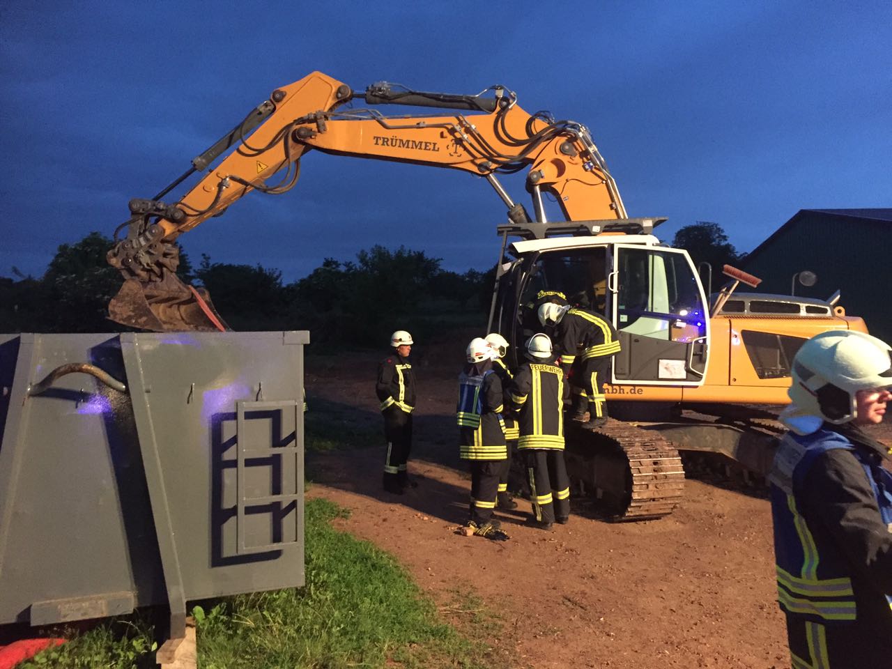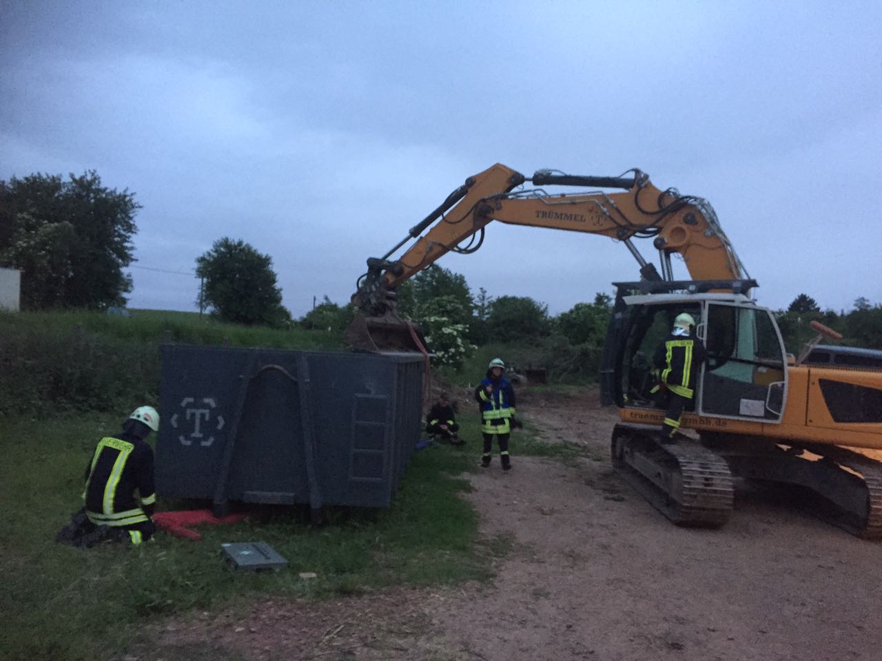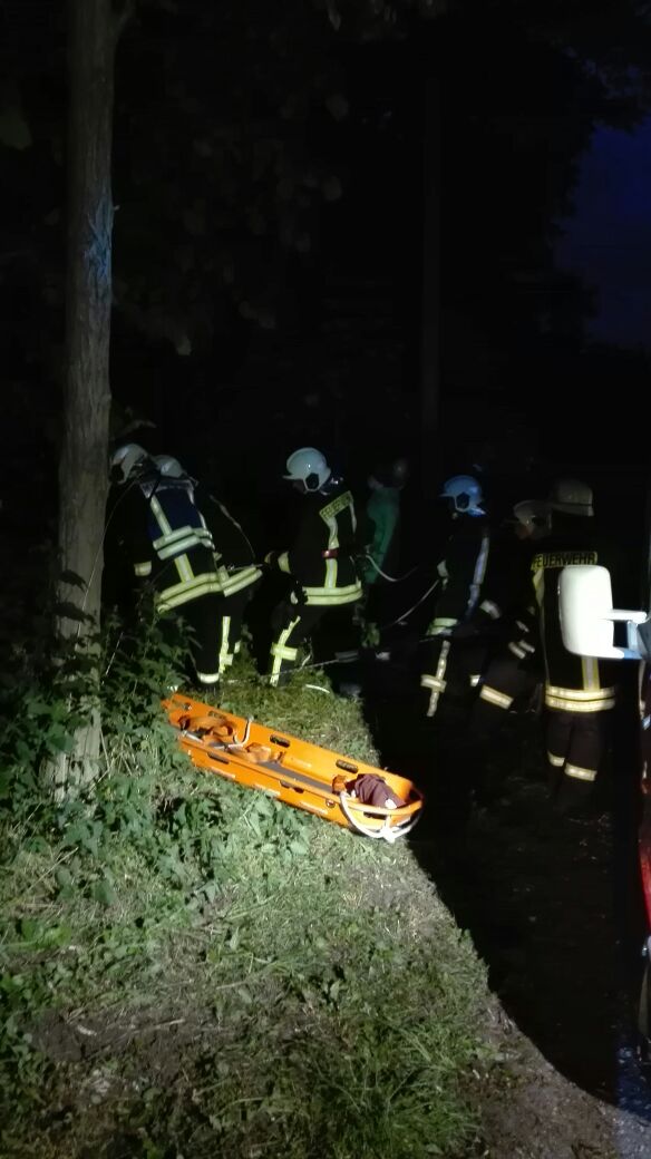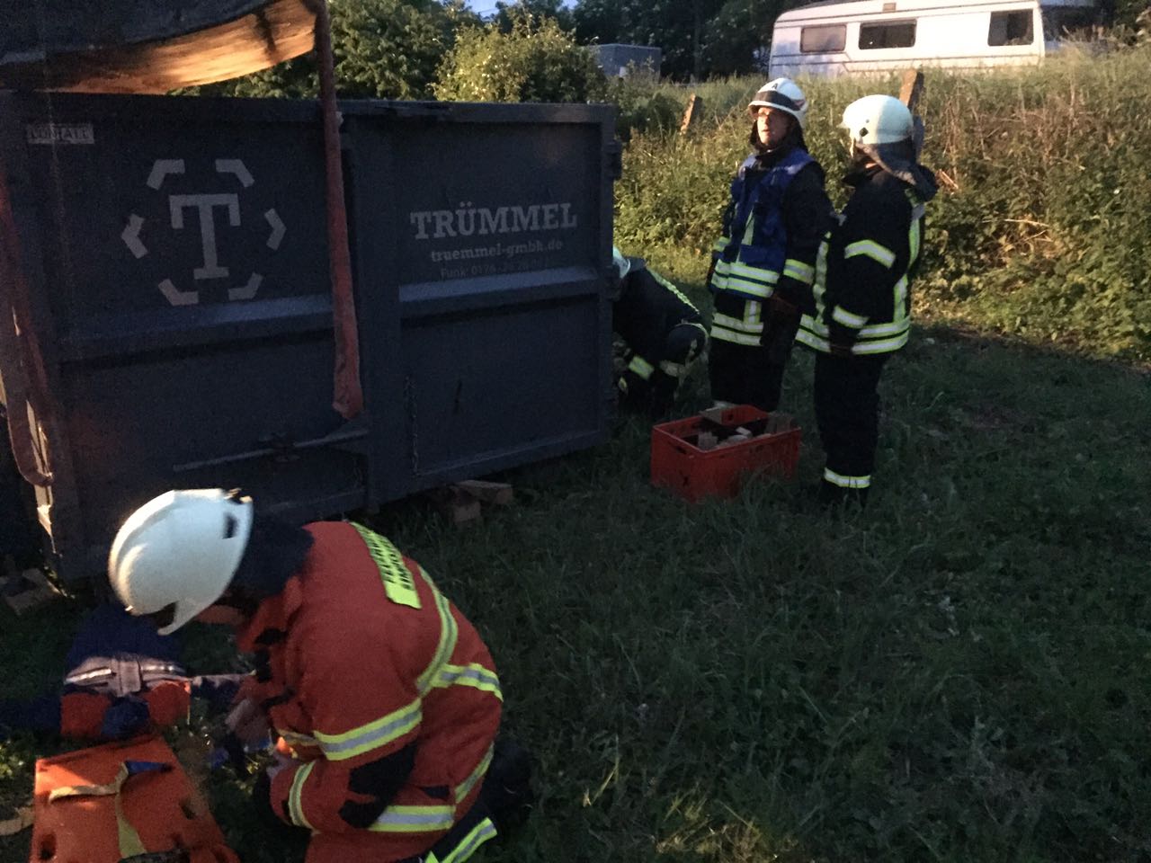 Gegen 21 Uhr war der reguläre Dienst beendet und alle konnten sich bei frischen Fischbrötchen stärken. Die Ruhe hielt allerdings nicht lange. Gegen 21:30 Uhr ertönten die Funkmeldeempfänger. Stichwort hier war ein Verladeunfall in einem Landwirtschaftlichen Betrieb zwischen Rollsdorf und Seeburg. Beim Eintreffen des Einsatzleitwagens (ELW), welcher das erste Fahrzeug vor Ort war, ergab sich nach der Lageerkundung des Zugführers folgendes Bild: ein 6 Tonnen schwerer Container war beim Verladen durch einen Kettenbagger ins straucheln gekommen und hatte dadurch 3 Personen schwer eingeklemmt. Durch den Aufprall des Containers war auch die Fahrerin des Kettenbaggers schwer verletzt. Gerade als der Zugführer die Einteilung der Einsatzkräfte vornehmen wollte ertönte erneut der Funkmeldeempfänger. Stichwort jetzt: Technische Hilfeleistung, Absturz von 2 Kindern aus großer Höhe, Lauraweg am Tonloch. Hier bestand jetzt die Schwierigkeit für den Zugführer die Kräfte und Mittel entsprechend der Schwerpunkte der Einsatzlagen aufzuteilen. Der Rüstwagen, der ELW, sowie das MTF Zappendorf und das Löschgruppenfahrzeug verblieben vor Ort in Rollsdorf. Beide TSF-W, das Tanklöschfahrzeug sowie der Sprinter mit zusätzlichen Kameraden machten sich auf den Weg zum Tonloch. In Rollsdorf lag natürlich der Schwerpunkt bei der Menschenrettung. Einer der Verletzten wurde noch vor Ort reanimationspflichtig. Nachdem die patientengerechte Rettung der Fahrerin des Kettenbaggers erfolgt war wurde nun versucht den Container beidseitig zu heben. Mit viel Fingerspitzengefühl und einer hohen Qualität in der Kommunikation erfolgte dies reibungslos. Alle Verletzten konnte ohne Probleme aus ihrer misslichen Lage befreit und medizinisch weiterversorgt werden. Unterdessen bot sich am Tonloch folgendes Lagebild: Beim Spielen sind Kinder einen circa 10m tiefen Abhang heruntergefallen. Nach einer ersten Erkundung ließ sich einer der Gruppenführer, der außerdem bei der Höhenrettung agiert, den Hang hinunter abseilen. Vor Ort konnten statt der gemeldeten 2, insgesamt 4 Kinder gesichtet werden. Alle 4 Kinder hatten Verletzungen. Weitere Kameraden wurden zur medizinischen Erstversorgung nach unten abgeseilt. Zur Rettung der Verletzten wurden hier zwei Einsatzabschnitte gebildet. Das schwer zugängliche Gelände sowie der Wildwuchs an Bäumen und Sträuchern erschwerten die Rettung ungemein. Mit zwei Schleifkorbtragen, die mit Führungsleinen gesichert und befestigt wurden, erfolgte nun die Rettung der Verletzten. An zwei unterschiedlichen Stellen, welche circa 10m auseinanderlagen, sollten die Schleifkorbtragen hinuntergelassen und danach mit den Verletzten hochgezogen werden. Bei jeder Trage sichert sich noch ein zusätzlicher Kamerad der die Patientenbetreuung übernimmt und mit den Kameraden die hochziehen kommuniziert und delegiert. Die Rettung gestaltete sich aber weitaus schwieriger wie zuerst angenommen. Die Kameraden welche den Einsatz in Rollsdorf beendet hatten wurde noch zusätzlich angefordert. Beim Eintreffen der zusätzlichen Einsatzkräfte waren 2 Kinder bereits gerettet. Die zwei anderen Kinder konnten dann durch die reibungslose Zusammenarbeit aller ebenfalls zeitnah am Hang hochgezogen werden. Die Auswertung der Einsätze erfolgte dann im Gerätehaus Röblingen. Bei Bratwurst und Steak besprachen alle Kameraden die vergangene Ausbildung und natürlich beide Einsatzübungen. Fehler wurden angesprochen, Einzelsituationen diskutiert und Verbesserungsvorschläge ausgearbeitet. Anschließend wurde der offizielle Teil beendet. Ein Großteil der Kameraden verblieb im Gerätehaus und übernachtete dort auf Feldbetten.