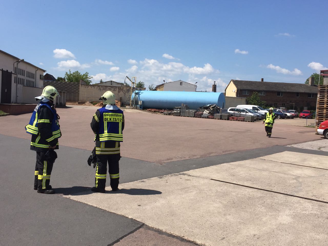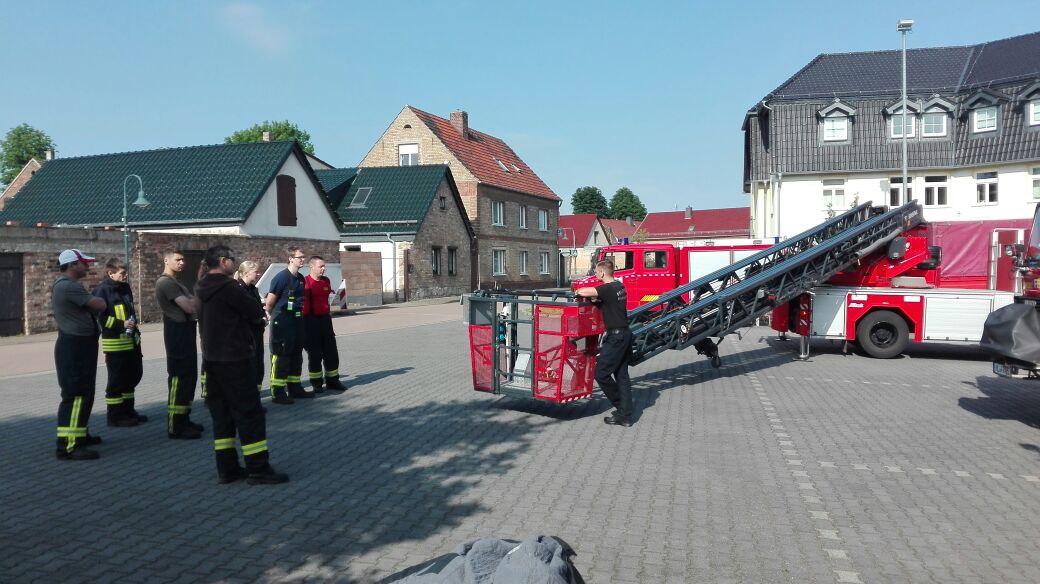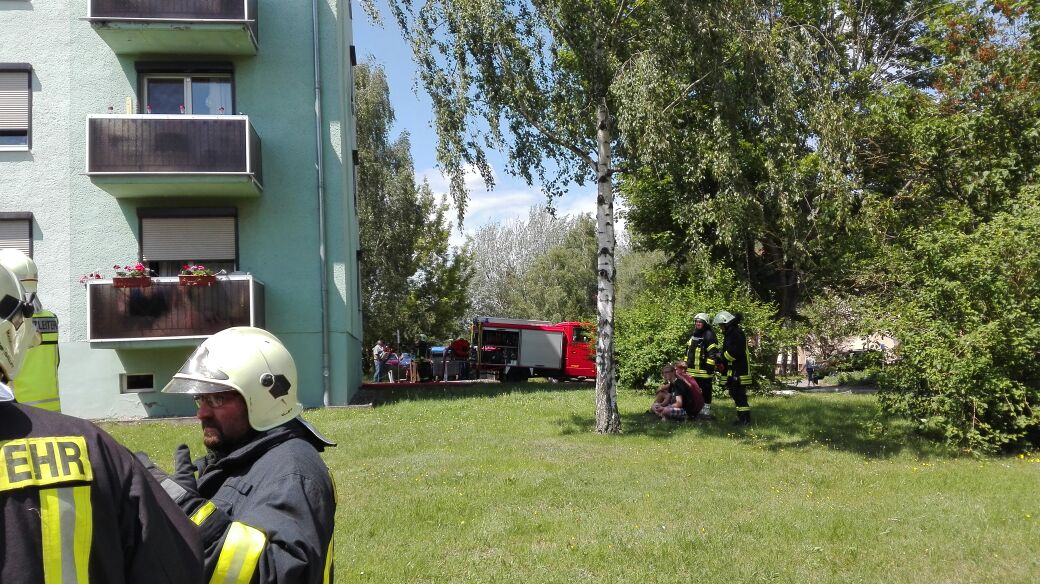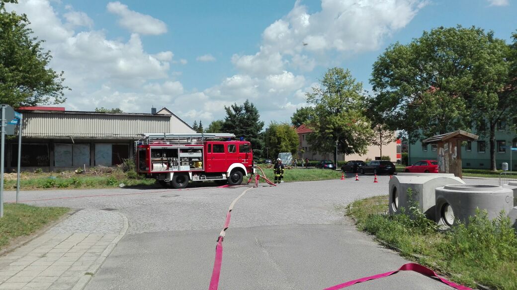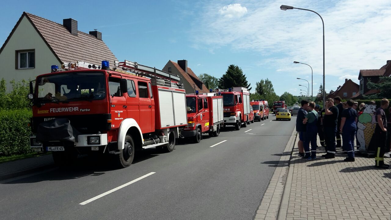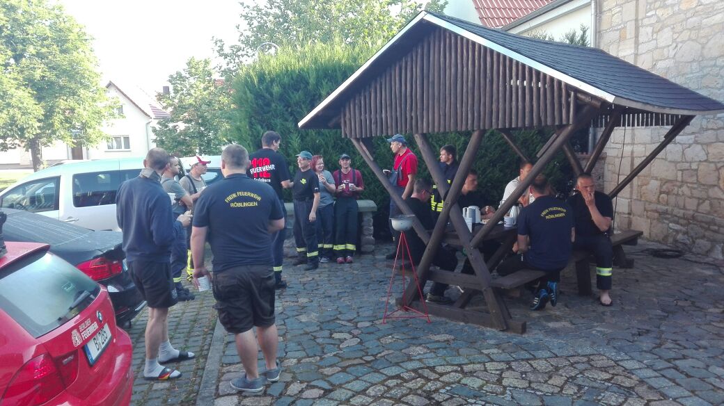 Gegen zwölf trafen sich alle Kameraden zum Mittagessen bei der Feuerwehr Wansleben. Die Kameraden führten an diesem Wochenende ihr traditionelles Feuerwehrfest durch. Dort ließen sich alle die Erbsensuppe schmecken. Kaum aufgegessen piepten sämtliche Funkmeldeempfänger. Stichwort war diesmal: Meldereinlauf LWG Röblingen. Sofort machten sich alle auf den Weg. Vor Ort ergab sich das in einem Lager für Düngemittel und Chemikalien ein Rauchmelder angeschlagen hat. Nachdem sich die ersten Kräfte mit Atemschutz ausgerüstet hatten und ins Objekt vorgehen wollten gab es einen erneuten Alarm. Hierbei handelte es sich um einen Wohnungsbrand in der August-Bebel-Straße. Auch hier war wieder das Geschick des Einsatzleiters gefragt seine Kräfte und Mittel gemäß den Einsatzschwerpunkten aufzuteilen. Das Löschgruppenfahrzeug, die Drehleiter, der Einsatzleitwagen und ein TSF-W verlegten in die Neue Siedlung. Das Tanklöschfahrzeug sowie das zweite TSF-W verblieben bei der LWG. In der August-Bebel-Straße bot sich den Einsatzkräften eine zunächst schwierige Lage. Die Brandwohnung befand sich im 4. Stock. Ein Kind befand sich auf dem Balkon und schrie um Hilfe. Sofort wurde eine adäquate Wasserversorgung zur Drehleiter sowie zum TSF-W aufgebaut. Die Drehleiter positionierte sich umgehend um über den Balkon den ersten Weg für eine Menschenrettung zu schaffen. Derweil gingen weitere Kräfte über das Treppenhaus zur Brandwohnung vor. Da die Wohnung vollständig verraucht war, wurde eine schnelle Durchsuchung der Wohnung extrem erschwert. Über das gerettete Kind bekam der Einsatzstab die Auskunft das es sich um circa 8 Personen in der Wohnung handle. Während des weiteren Absuchen nach möglichen Personen verunfallte ein Atemschutzgeräteträger. Nun war das erworbene Wissen vom Vormittag für den Sicherungstrupp gefragt. Möglichst zügig muss der verunfallte Kamerad aus dem Brandobjekt hinausgebracht und medizinisch versorgt werden. Weitere vermisste Personen konnten nach und nach ausfindig gemacht und zur Verletztensammelstelle verbracht werden. Nach dieser körperlich sehr fordernden Übung und der anschließenden Auswertung fuhren alle zusammen zur Eisdiele und kühlten sich wohlverdient ab. Die Kameraden aus Teutschenthal verabschiedeten sich an dieser Stelle und traten den Heimweg an.