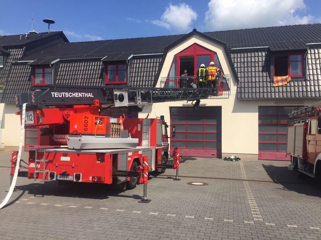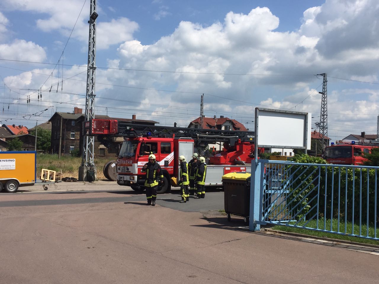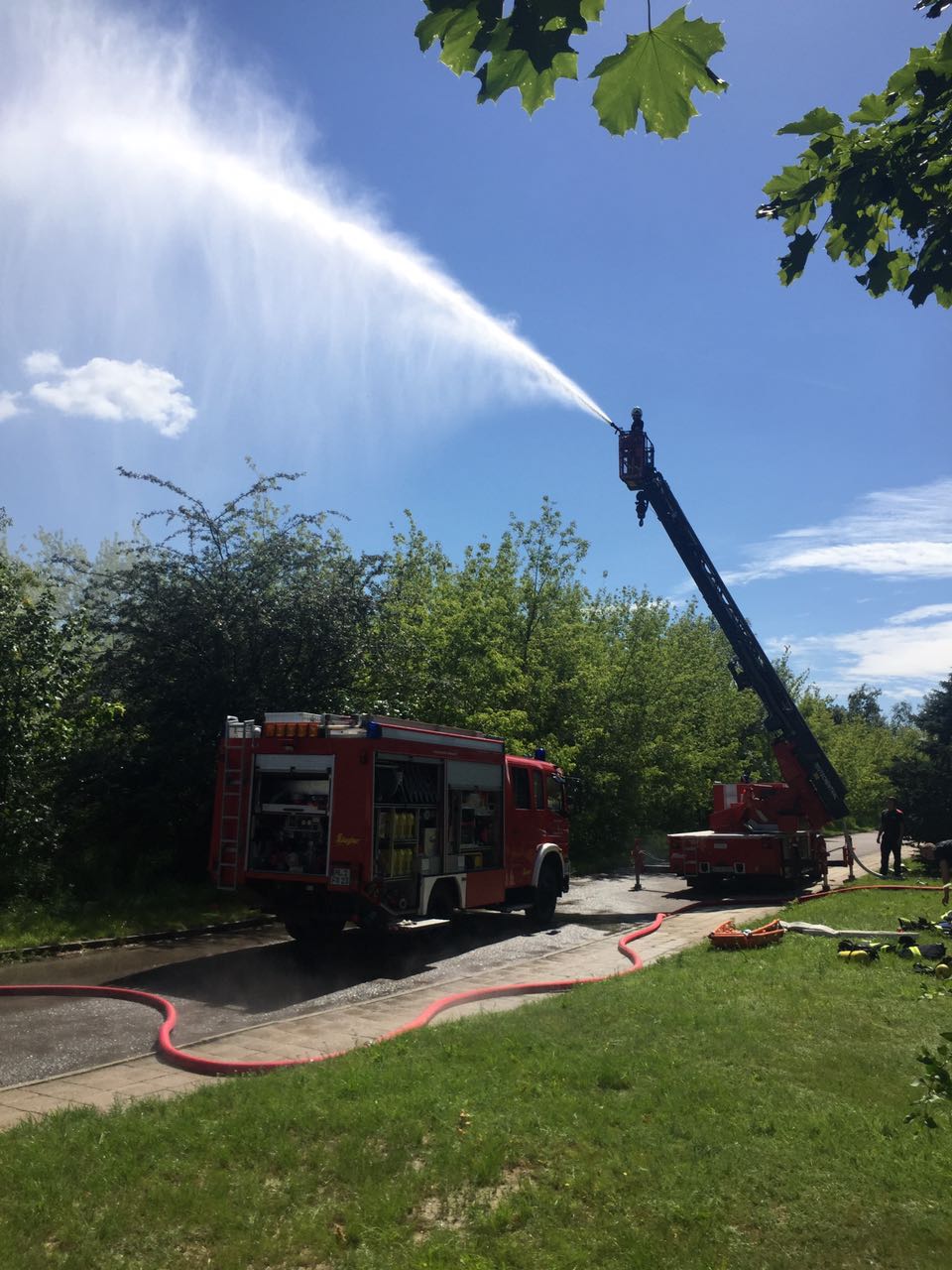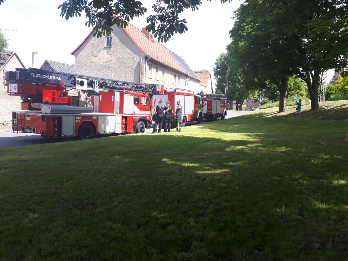 Gegen zwölf trafen sich alle Kameraden zum Mittagessen bei der Feuerwehr Wansleben. Die Kameraden führten an diesem Wochenende ihr traditionelles Feuerwehrfest durch. Dort ließen sich alle die Erbsensuppe schmecken. Kaum aufgegessen piepten sämtliche Funkmeldeempfänger. Stichwort war diesmal: Meldereinlauf LWG Röblingen. Sofort machten sich alle auf den Weg. Vor Ort ergab sich das in einem Lager für Düngemittel und Chemikalien ein Rauchmelder angeschlagen hat. Nachdem sich die ersten Kräfte mit Atemschutz ausgerüstet hatten und ins Objekt vorgehen wollten gab es einen erneuten Alarm. Hierbei handelte es sich um einen Wohnungsbrand in der August-Bebel-Straße. Auch hier war wieder das Geschick des Einsatzleiters gefragt seine Kräfte und Mittel gemäß den Einsatzschwerpunkten aufzuteilen. Das Löschgruppenfahrzeug, die Drehleiter, der Einsatzleitwagen und ein TSF-W verlegten in die Neue Siedlung. Das Tanklöschfahrzeug sowie das zweite TSF-W verblieben bei der LWG. In der August-Bebel-Straße bot sich den Einsatzkräften eine zunächst schwierige Lage. Die Brandwohnung befand sich im 4. Stock. Ein Kind befand sich auf dem Balkon und schrie um Hilfe. Sofort wurde eine adäquate Wasserversorgung zur Drehleiter sowie zum TSF-W aufgebaut. Die Drehleiter positionierte sich umgehend um über den Balkon den ersten Weg für eine Menschenrettung zu schaffen. Derweil gingen weitere Kräfte über das Treppenhaus zur Brandwohnung vor. Da die Wohnung vollständig verraucht war, wurde eine schnelle Durchsuchung der Wohnung extrem erschwert. Über das gerettete Kind bekam der Einsatzstab die Auskunft das es sich um circa 8 Personen in der Wohnung handle. Während des weiteren Absuchen nach möglichen Personen verunfallte ein Atemschutzgeräteträger. Nun war das erworbene Wissen vom Vormittag für den Sicherungstrupp gefragt. Möglichst zügig muss der verunfallte Kamerad aus dem Brandobjekt hinausgebracht und medizinisch versorgt werden. Weitere vermisste Personen konnten nach und nach ausfindig gemacht und zur Verletztensammelstelle verbracht werden. Nach dieser körperlich sehr fordernden Übung und der anschließenden Auswertung fuhren alle zusammen zur Eisdiele und kühlten sich wohlverdient ab. Die Kameraden aus Teutschenthal verabschiedeten sich an dieser Stelle und traten den Heimweg an.
