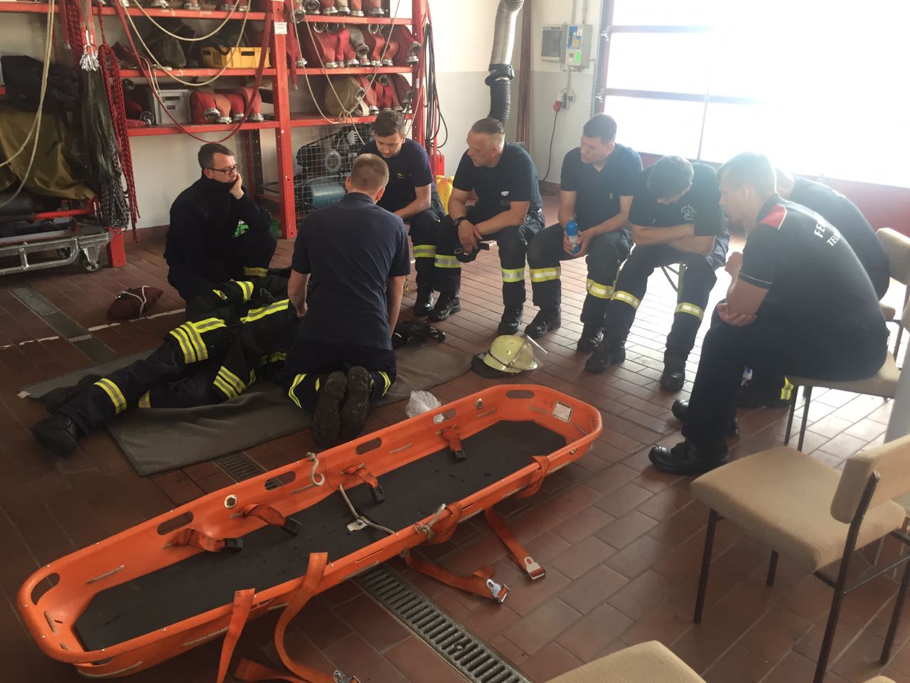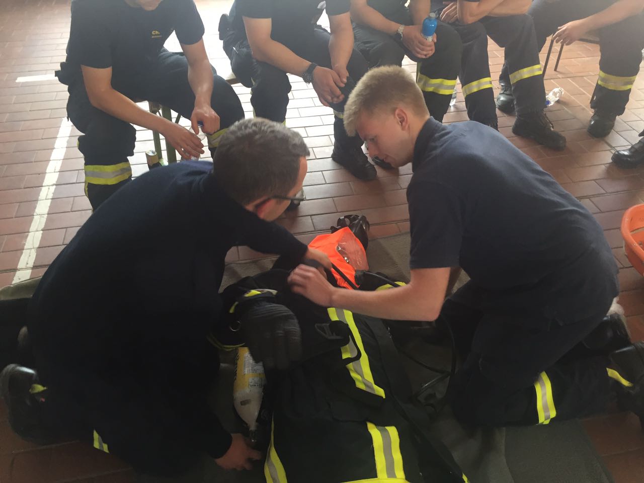 Die zweite Gruppe verblieb am Gerätehaus. Hier wurde, mit einer Halbgruppe der Einstieg ins Brandobjekt über die Drehleiter geübt. Die zweite Halbgruppe trainierte den Atemschutznotfall mit Kamerad Steffen Thürmer aus Berlin. Beide Ausbildungseinheiten waren vorrangig für Atemschutzgeräteträger gedacht. Ziel dieser Ausbildungen war es handlungssicher bei einem Atemschutznotfall agieren zu können. Ebenso war es wichtig zu üben wir man sich auf einer Drehleiter verhält bzw. wie der korrekte Einstieg über ein Fenster in das Brandobjekt erfolgt.
