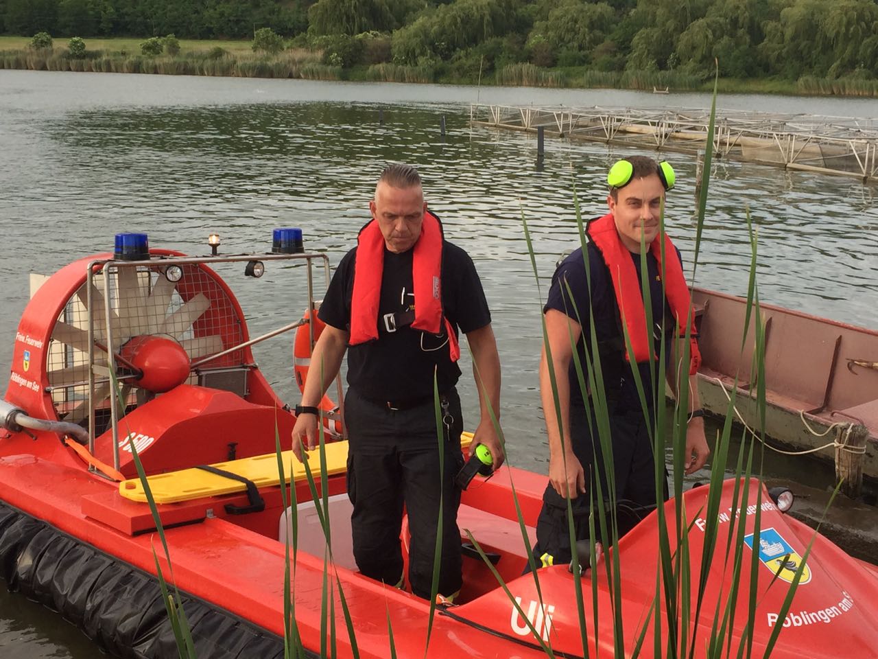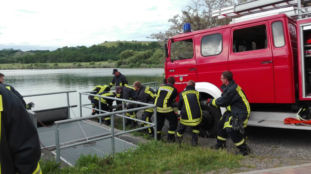Danach wurden zunächst zwei Ausbildungsgruppen gebildet. Die erste Gruppe unter Leitung von Heiko Hennig begab sich zu einem Objekt in der Lange Straße. Dort konnte in einem rund 5m tiefen Schacht die Rettung aus der Tiefe ausgebildet und beübt werden. Einige Kameraden, welche den erforderlichen Lehrgang schon haben, konnten ihr bereits erworbenes Wissen auffrischen. Kameraden welchen diese Thematik noch fremd war erhielten so einen ersten Eindruck und konnten Grundlagenwissen erlangen. Die zweite Ausbildungsgruppe verlegte mit allen Fahrzeugen zum Kernersee. Am Fischerhof bekamen wir die Gelegenheit die Ausbildungseinheit „Wasserförderung offenes Gewässer“ durchzuführen sowie an den Pumpen und Tragkraftspritzen zu schulen bzw. zu üben. Eine driite Ausbildungseinheit bildeten die Bootsführer des Hoovercrafts sowie die Kameraden aus Seeburg. Sie trainierten den Umgang mit dem Luftkissenboot bzw. dem Schlauchboot sowie das retten von Personen aus Gewässern.