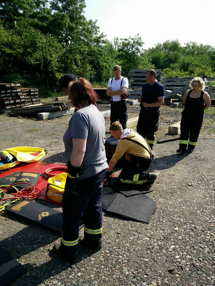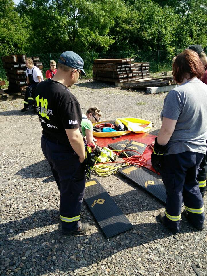 Am Samstagmorgen 8 Uhr,bei wolkenfreien Himmel und herrlichstem Sonnenschein, frühstückten alle zusammen im Außenbereich der Röblinger Wehr. An diesem Tag waren ebenfalls wieder Gastwehren dabei. Im Anschluss wurden zwei Ausbildungsgruppen gebildet. Eine Gruppe machte sich auf den Weg zum Gelände der Firma Künstler Bau. Dort wurde unter Leitung von Kamerad Michael Gelbke eine Ausbildungseinheit zum Thema Technische Hilfeleistung, mit Schwerpunkt Heben von Lasten, durchgeführt. Mehrere Bahnschwellen aus Beton sowie ein Stahlträger hatten eine Puppe unter sich begraben. Ziel der Ausbildung war es, mit den zur Verfügung stehenden Mitteln, die Last zu heben und die Puppe zu befreien. Schritt für Schritt wurde alles besprochen und dann jeweils durchgeführt. Da die Gruppe aus Kameraden mit und ohne bereits absolvierten TH-Lehrgang bestand, war es besonders interessant verschiedene Ansatzpunkte zu finden und diese gemeinsam umzusetzen.