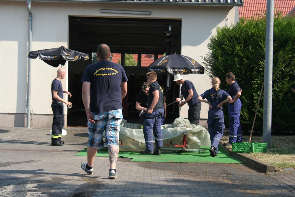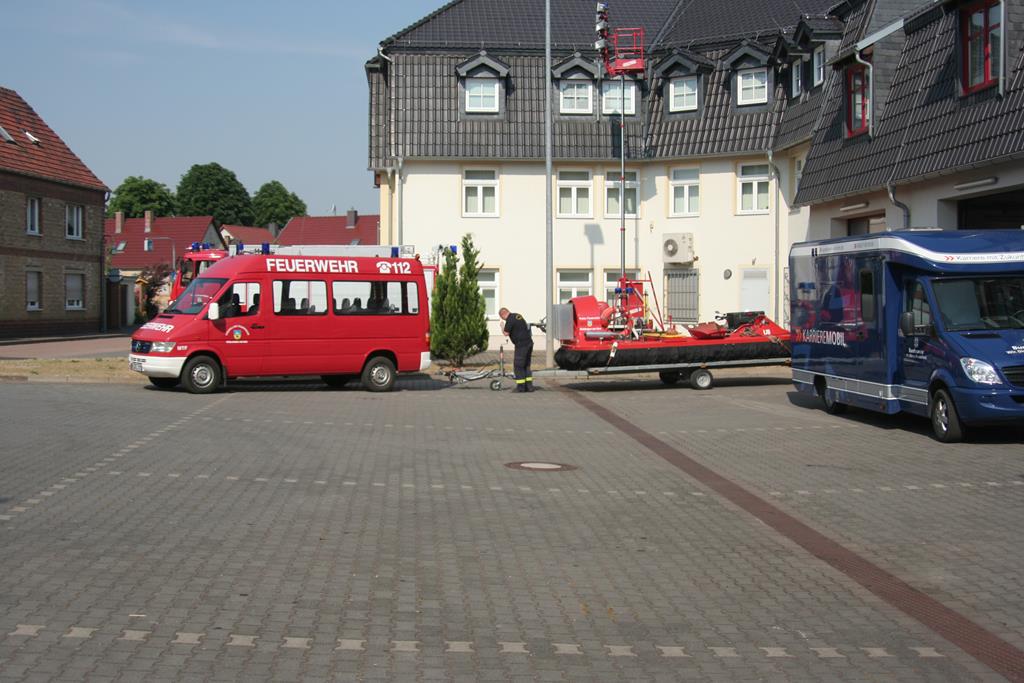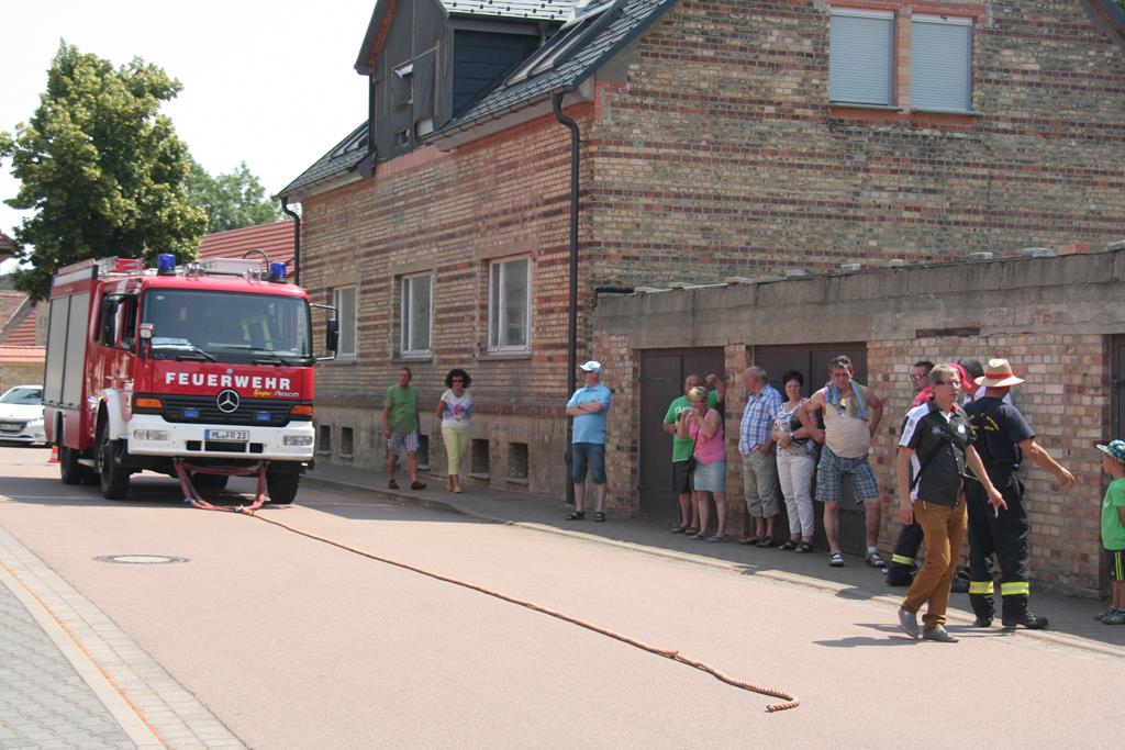 Auf dem Vorplatz der Feuerwehr standen unsere Autos sowie die Drehleiter der FF Teutschenthal um den Besuchern einen Einblick an aktueller Einsatztechnik zu gewähren. Die Kameradinnen und Kameraden standen Rede und Antwort um alle aufkommenden Fragen zu klären. Des Weiteren war die Bundeswehr mit dem Karrieremobil und 2 Beratern vertreten. Aber auch unsere jüngsten Besucher solltennicht zu kurz kommen. Gegen 11:30Uhr gab es ein Puppentheater und anschließend konnte sich beim Dosenspritzen ausgetobt werden. Die hohen Temperaturen an diesem Tag lockten dann die Großen und Kleinen in den Pool mit „Springbrunnen „. Dieser wurde eigens für diesen Tag nur mit der Hilfe von Gerätschaften der Feuerwehr von den Kameraden gebaut. Natürlich dauert es da nicht lange bis die ersten Kinder und Erwachsenen darin badeten. Ab 13:00Uhr fand unser alljährliches „Tankerwettziehen“ statt. Trotz der zum Teil unangenehmen Außentemperaturen fanden sich 6 mutige Mannschaften um gegeneinander anzutreten. Das Publikum ließ es sich nicht nehmen und feuerte alle Teilnehmer gebührend an. Der Titelverteidiger aus dem letzten Jahr musste dieses Mal leider seine Position räumen. Die Kameraden der OF Röblingen gewannen im zweiten Lauf mit minimalem Zeitvorsprung vor dem Team Heerdegen. Über den verdienten 3. Platz konnte sich die Männermannschaft Erdebor/Lüttchendorf freuen. Wir danken nochmals allen Teams für die Einsatzbereitschaft und freuen uns euch im nächsten Jahr wieder begrüßen zu dürfen. Großen Respekt an die Frauenmannschaft aus Erdeborn.