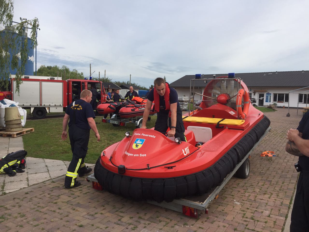 Danach wurden zunächst zwei Ausbildungsgruppen gebildet. Die erste Gruppe unter Leitung von Heiko Hennig begab sich zu einem Objekt in der Lange Straße. Dort konnte in einem rund 5m tiefen Schacht die Rettung aus der Tiefe ausgebildet und beübt werden. Einige Kameraden, welche den erforderlichen Lehrgang schon haben, konnten ihr bereits erworbenes Wissen auffrischen. Kameraden welchen diese Thematik noch fremd war erhielten so einen ersten Eindruck und konnten Grundlagenwissen erlangen. Die zweite Ausbildungsgruppe verlegte mit allen Fahrzeugen zum Kernersee. Am Fischerhof bekamen wir die Gelegenheit die Ausbildungseinheit „Wasserförderung offenes Gewässer“ durchzuführen sowie an den Pumpen und Tragkraftspritzen zu schulen bzw. zu üben. Eine driite Ausbildungseinheit bildeten die Bootsführer des Hoovercrafts sowie die Kameraden aus Seeburg. Sie trainierten den Umgang mit dem Luftkissenboot bzw. dem Schlauchboot sowie das retten von Personen aus Gewässern.